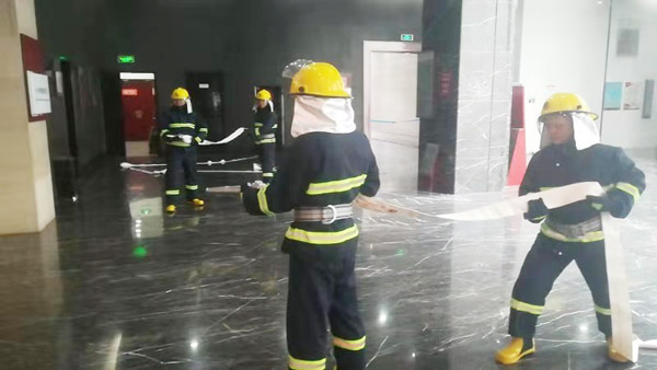 中隊隊員在每日消防訓(xùn)練前,在中隊長的帶領(lǐng)下認真學(xué)習(xí)消防安全知識,滅火器和消火栓等消防器材的使用方法,以及火災(zāi)發(fā)生時的應(yīng)急措施。中隊理論與實踐相結(jié)合,提高隊員的實際處置火險能力,組織隊員開展初起火災(zāi)的撲救、自我安全保護、組織人員疏散、消防設(shè)施和器材的操作等訓(xùn)練。訓(xùn)練中,特保隊員發(fā)現(xiàn)火情后,立即啟動火災(zāi)應(yīng)急處置方案,有的隊員迅速穿上消防服裝,觀察樓層火情,隔離起火設(shè)備,有的連接消防栓,打開滅火器撲滅火險。